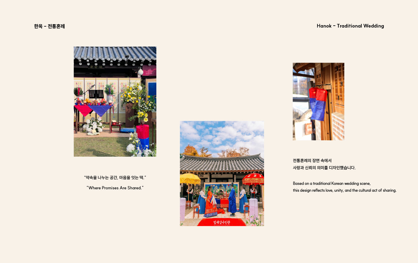 우리의 전통떡은 단순한 간식을 넘어, 한국전통의 삶과 문화를 담아내는 상징적 K-콘텐츠로 정의하였습니다. 전통건축을 모티브로 한 외형과 팝업북 내부구조를 통해, 돌잔치•혼례• 환갑 등 한국 전통의례 속 떡의 의미를 시각화했습니다. 먹는 경험을 넘어, 문화를 전달하는 감성 콘텐츠형 패키지디자인로 글로벌 시장에 K-디저트의 가치를 제안합니다.